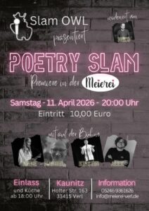 Zum ersten Mal findet ein Poetry Slam in der Meierei in Verl statt, alle Infos auf der Plakatgrafik 🙂