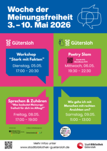 Beim Poetry Slam zur Woche der Meinungsfreiheit präsentieren Poet:innen ihre selbstgeschriebenen Texte – mal humorvoll, mal nachdenklich, immer überraschend. Wie bei jedem Poetry Slam werden die Poet*innen selbst geschriebene Texte innerhalb von sechs Minuten auf der Bühne performen. Dabei ist es egal, ob lustig oder ernst, ob Stand Up oder Lyrik. Alles kann bei einem Poetry Slam stattfinden. Damit werden wir eine breite Vielfalt an Perspektiven und Meinungen auf einer Bühne an einem Abend sehen. Das Publikum entscheidet über den besten Beitrag. Ein Abend voller Wortkunst, Witz und Haltung. Es präsentiert das Team von Slam OWL, unter der Moderation von Niko Sioulis.