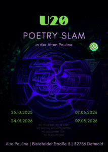 Der U20 Slam in der alten Pauline in Detmold findet drei Mal pro Jahr außerhalb der Sommerpause statt. Hier treten junge Poet* innen bis zu 20 Jahren an, bei einem der neueren Poetry Slam Wettbewerben der Region.Los geht es immer um 19:00 Uhr und Einlass ist immer um 18:00 Uhr, mit der Möglichkeit sich etwas zu trinken zu bestellen und den Abend so schön zu genießen. Hierbei gibt es ausschließlich eine Abendkasse.