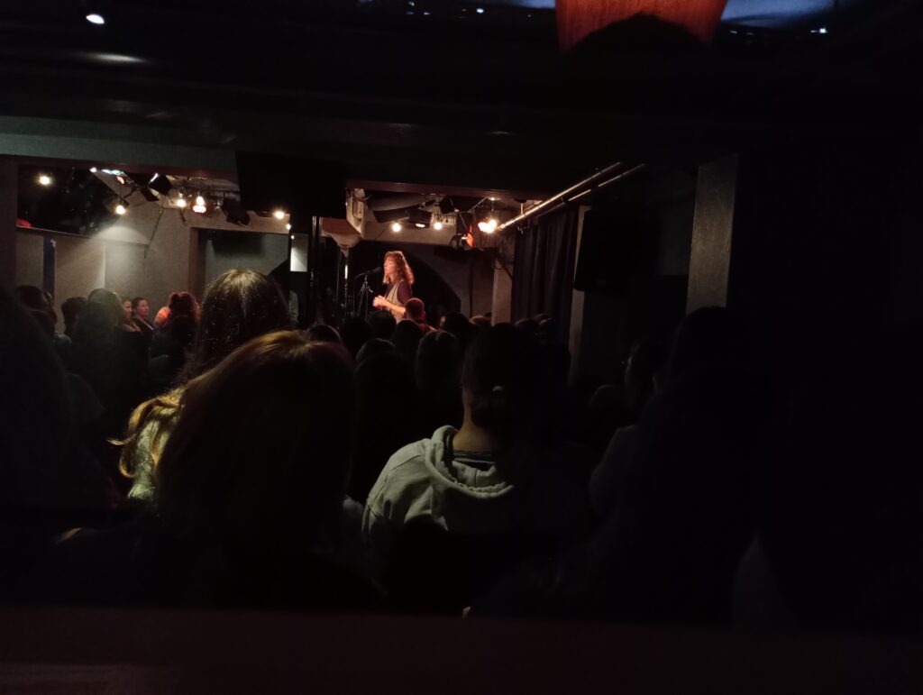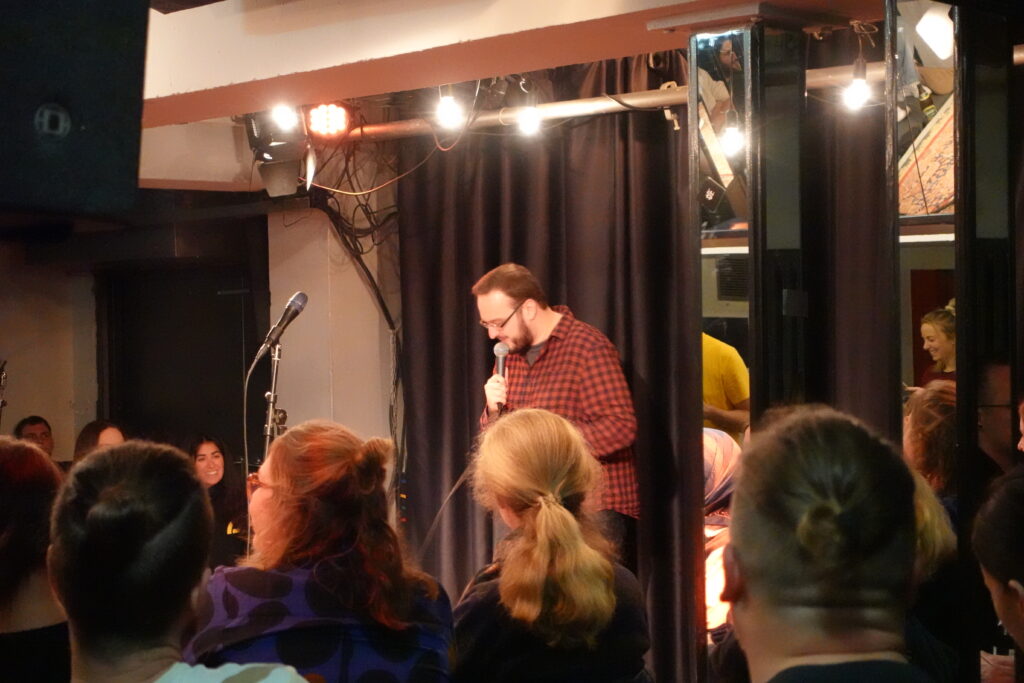 Früher stand das Mikrofon so, dass die Auftretenden sich beim Vortragen selbst anschauen konnten. Das ist mittlerweile nicht mehr so. Viele Poet:Innen überlegen sich vor ihrem ersten Auftritt im Bunker Ulmenwall, wo sie am besten hin schauen können, da sie auf der Bühne von Publikum umgeben sind. Auf beide Seiten verteilt sitzt das Publikum, das nicht zeitgleich komplett angeguckt werden kann, während vor der Bühne im Gang auch immer ein paar Menschen sitzen.