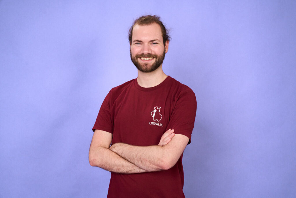 In ausbuchstabiert: Niko macht Slam seit 2011, moderiert und organisiert Veranstaltungen seit 2013 und gibt Workshops seit 2015. In dem Jahr hatte er auch die Verantwortung für die Onlinepräsenz von Slam OWL übernommen. Er ist sehr glücklich, dass er dabei mittlerweile Social Media zu einem großen Teil abgeben kann. Niko findet ihr bei den meisten unserer Veranstaltungen als Moderator auf der Bühne, manchmal auch parallel Fotos und alle anderen anfallenden Jobs machen. Das wird besser, lest unten gerne bei unseren anderen fantastischen Menschen, wie sie helfen und welche Arbeit sie übernehmen. Wenn ihr uns Mails schreibt, beantwortet Niko euch diese. Bei einigen unserer Mailadressen. Und er leitet unsere Schreibwerkstatt auf Discord. Er macht das ganze „Bühnenzeugs“ übrigens beruflich. Momentan schreibt er pro Jahr mehr Auftrags- als eigene Slamtexte. Mit letzteren tritt er auch noch auf; da wo er bei uns nicht moderiert, oder weiter weg. Mehr dazu hier.