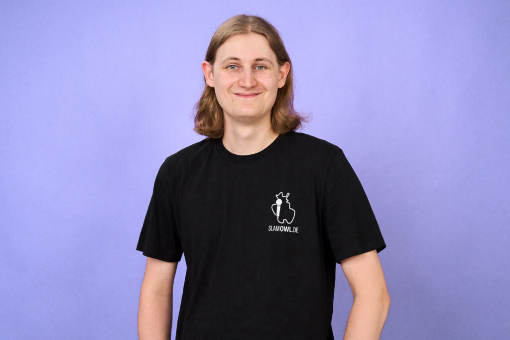 Malte Mersch ist Baujahr 1999, und hasst es auf der Bühne zu stehen. Wie das mit Slam OWL zusammenpasst? Malte ist seit 2020 hinter den Kulissen als Videomensch für uns unterwegs. Neben zahlreichen verschiedenen Digitalformaten (Mutters Sprache, Hör mir zu, Mensch sein etc.) veranstaltet er seit 2024 auch seine eigene Veranstaltung einmal im Jahr. Der Bielefelder Videoslam. Malte kümmert sich außerdem darum, dass unsere E-Mails laufen, Großveranstaltungen wie der Slam24 aufgezeichnet und verwertet werden, und ganz manchmal, wenn er Lust hat, auch um ein paar TikTok Posts. Das ist aber eher seltener der Fall.